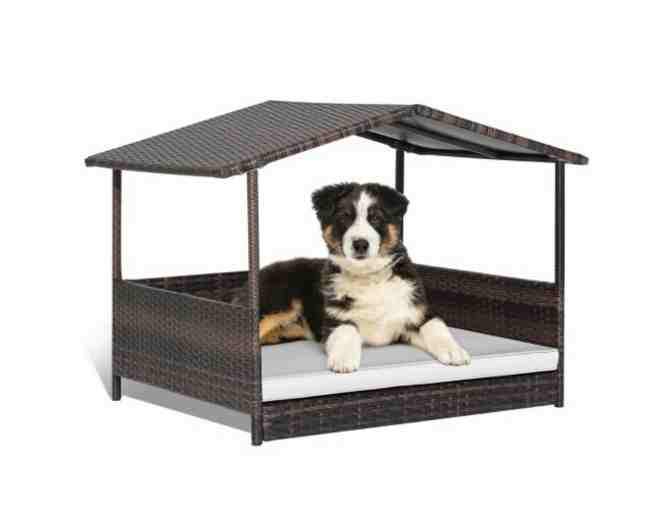 Features:PE rattan makes the dog house long lasting Heavy-duty steel frame for high stability Roof covers your pet from rain and sunlight