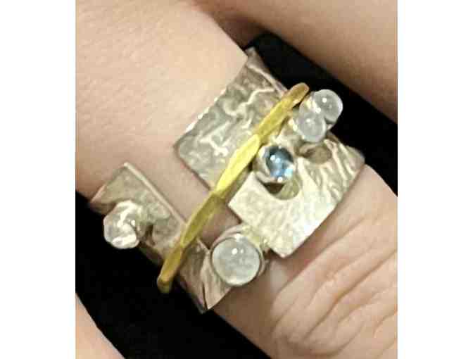 A sterling silver and brass ring with with a relief detail, handmade in Bisbee, AZ. It is sized 8.5. The overall band width is 1.5 cm and includes a total of five polished labradorite and moonstones.