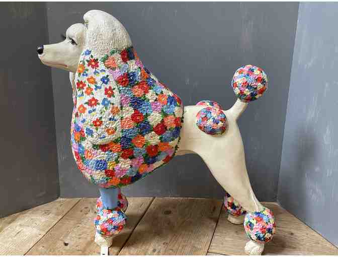 Drawn from the timeless allure of Brigitte Bardot, "Brigitte Bardog" emerges as a vivacious and brightly colored poodle, complete with enchanting, long eyelashes. "Brigitte Bardog" is not just a representation of canine charm but a testament to the remarkable journey of its creator, Kathy Sharpe. Bid now to bring this vivacious poodle into your collection and celebrate the fusion of artistry, inspiration, and timeless allure.