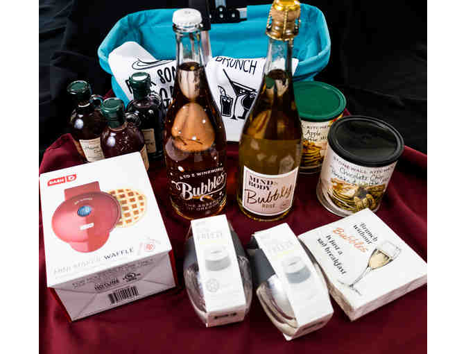 This gourmet brunch basket is full of all things brunch! Included is two bottles of bubbly, two gourmet pancake/waffle mixes (apple cinnamon and chocolate chip), three gourmet syrups (maple, Maine blueberry and raspberry), mini waffle maker, two stemless wine glasses that can be frozen to keep drinks cold, two brunch themed tea towels and a set of brunch napkins!