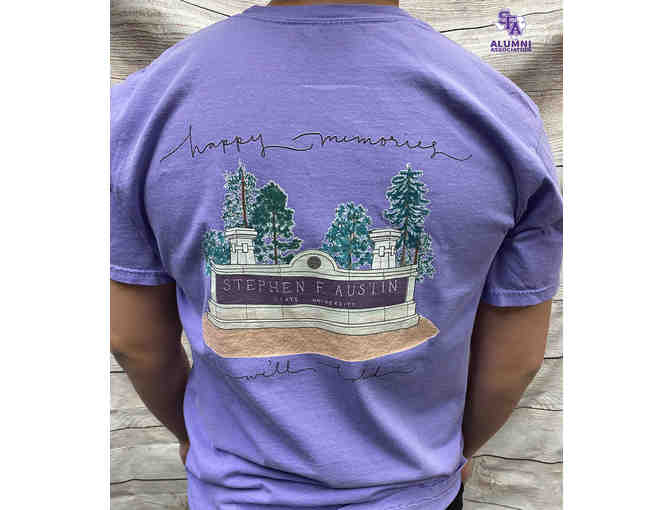 This t-shirt features the "axe 'em" sign on the front, and one of SFA's beautiful entrances on the back.