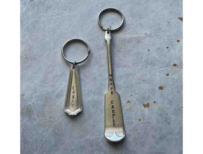 Need a unique bag tag or key chain?  These faux "reclaimed silver" items will fit the bill!  "Loved" and "Happy Camper"