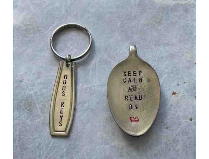 Need a unique bag tag or key chain? How about a book mark? These faux "reclaimed silver" items will fit the bill!  "Mom's Keys" and "Keep Calm and Read On"