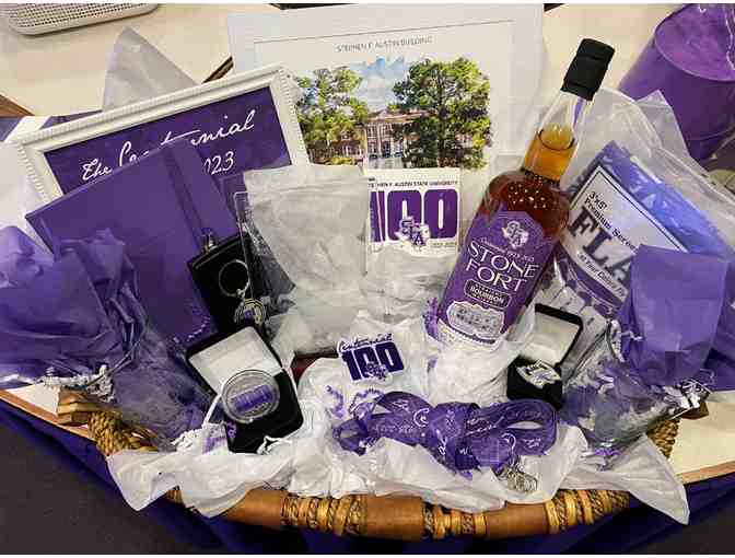 Don't miss out on this one-of-a-kind SFA Centennial Basket! All of the items will be collector's pieces for SFA Lumberjacks and you can't find most of these items outside of this basket. The basket includes a light-up acrylic Surfin' Steve light, watercolor print of the Austin Building, framed Centennial logo, Centennial challenge coin, #109 Stone Fort Bourbon, (2) SFA Highball glasses, Centennial patch, lanyard, lapel pin, 3' X 5' flag, keychain, fountain pen, notebook, and magnet.