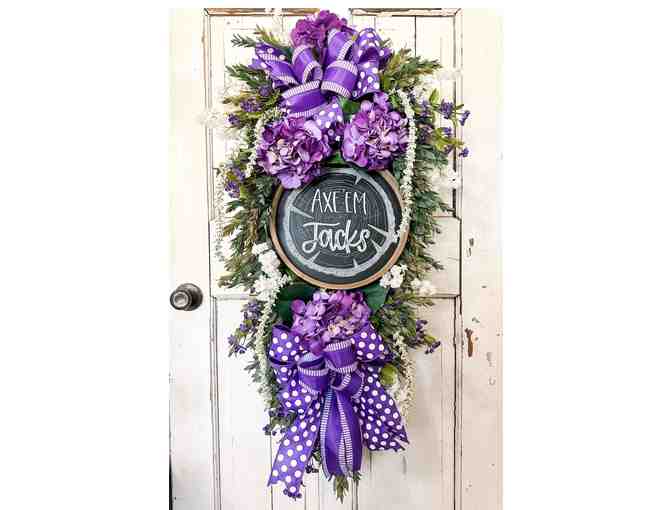 Custom made wreath featuring Lumberjack purple hydrangeas, gorgeous greenery with purple ribbon accents and a hand lettered chalkboard center.