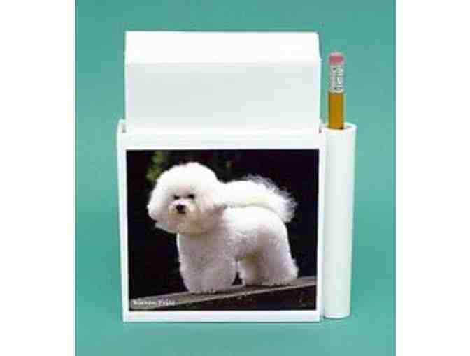 Magnetic hold-a-note is ideal for shopping lists, messages or reminders. With a strong magnet on the back, the Bichon Frise hold-a-note adheres to refrigerators, filing cabinets or any steel surface. Comes packed with paper and a pencil. Approximate size, with paper, is 4.25 x 5.25 x 1 inch. Made in the USA.
