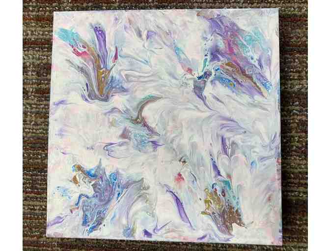 Abstract Acrylic by Karen Montchal. Measures 8" x 8" x 1". Pinks, Purples, Blues, Browns, Reds, Beiges, grey, gold..