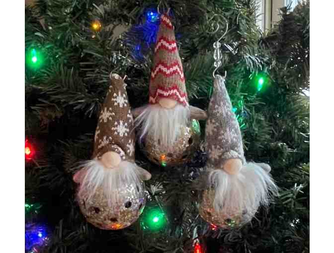 Broken pickleballs were collected from local courts, cracks filled, given a base color coat, several coats of glitter and sealer, and then dressed as cute gnomes!