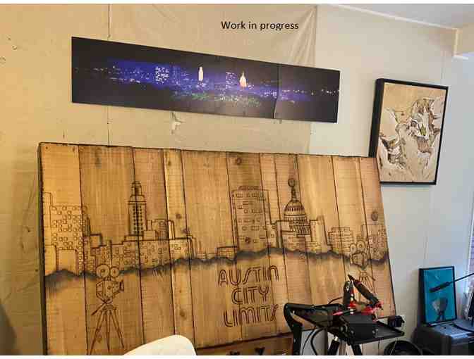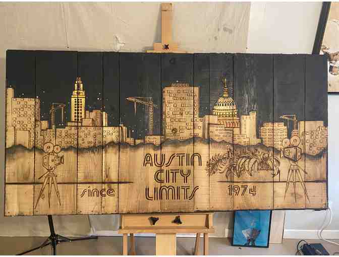 Inspired by the backdrop from Austin City Limits television set, this one-of-a-kind work of art is burned and painted on wood planks from the original Studio 6A stage used through Season 36. Austin artist Carly Jo Purswell has magically created this one-of-a-kind piece of Made In Austin art history.