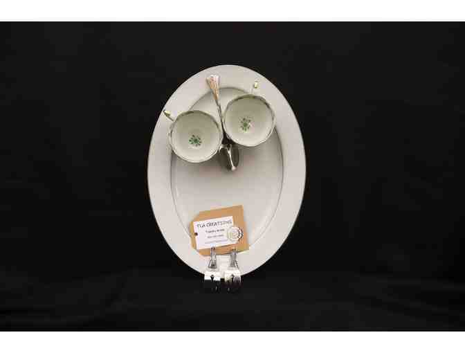 Owl garden sculpture made out of vintage and modern glassware. Comes with garden stake.