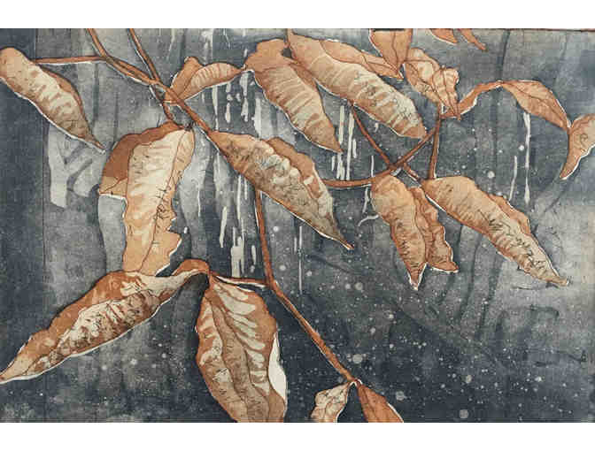 7" x 10" Etching and Aquatint handprinted on BFK Rives paper. This is an image taken during a hike in the winter where I noticed that these leaves never fall persisting and being resilient. Aquatint etching is a printmaking technique that produces a full tonal range and rich texture by exposing a copperplate to acid through a layer of melted granulated resin. Aquatint is a variety of etching that belongs to the intaglio family of printmaking techniques, in which the image is incised into a surface and the incised line or sunken area holds the ink. Aquatint differs from etching in that it creates more tonal and textured areas in a final print, resembling watercolor or wash drawings. Aquatint can be etched in a bath of acid or by painting the acid directly on the plate.