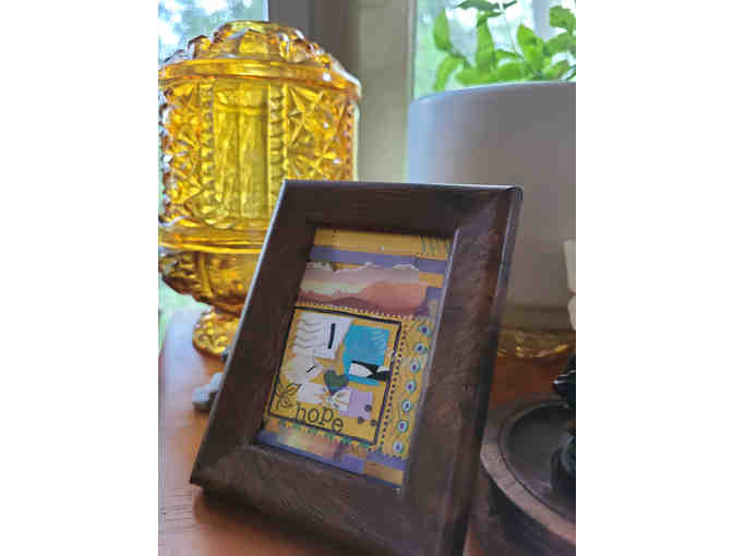 2.5" x 3.5" original artist trading card (ATC) paper collage with custom artist stamp from 2022 "Hope" issue, in a 3" x 4" wooden frame.