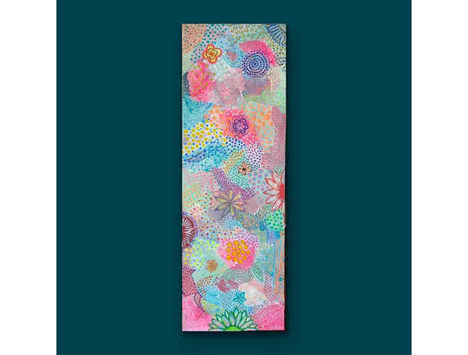 Mixed media 12" x 36" on a textured canvas. Colorful, floral dots.