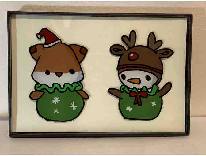Festive glass painting made with acrylic paint on a 4" x 6" sheet of glass. Comes in a MCS Format picture frame. Get creative and replace the background sheet of paper with a holiday background or whatever you desire, but please be gentle in removing the glass from the frame.