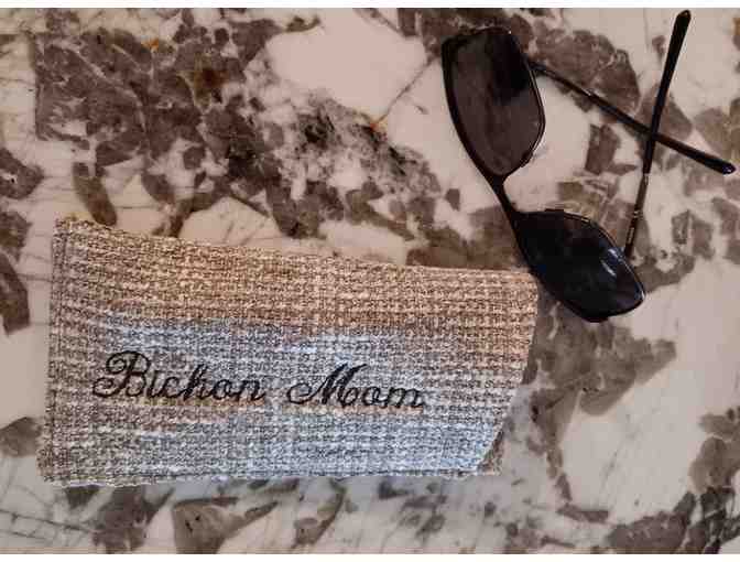 Protect your reading or sunglasses with this sophisticated glasses holder made of home decorator's fabric in tans and creams. "Bichon Mom" is embroidered in dark brown.