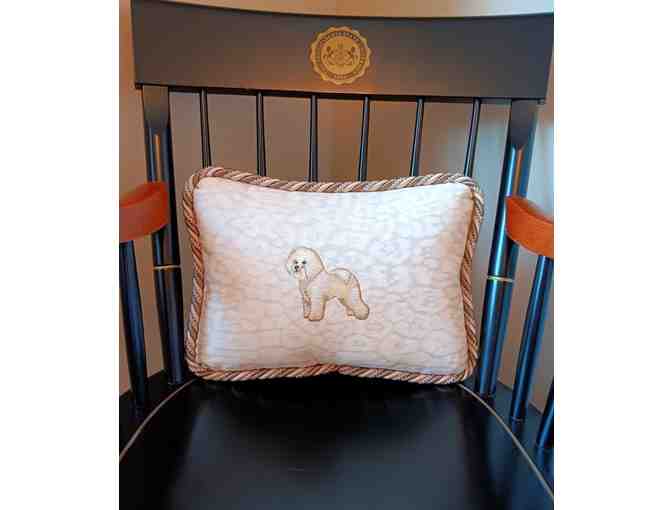 Made of cream decorator's fabric with a full body Bichon embroidered in middle. Matching cording trim.