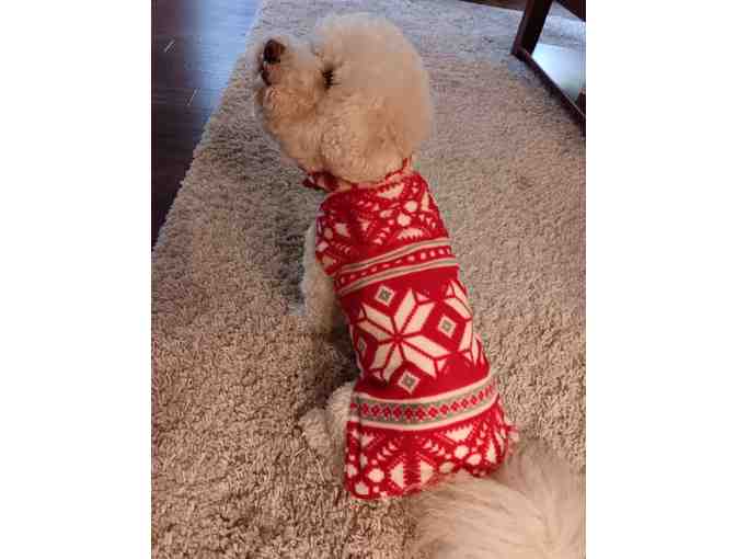 Red and white Christmas sweater with snowflakes. Whether you wear the sweater and scarf together or separately, you are sure to have people smile as they walk by. Velcro closure around neck and belly for easy on, easy off.