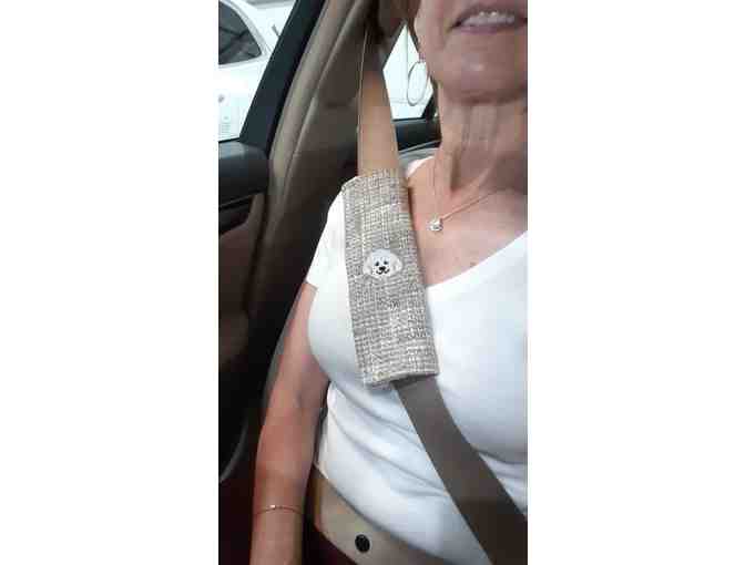 Tired of your seatbelt digging into your neck? This seatbelt cover gives the added protection and softness. Made of home decorator's fabric in tans/creams.
