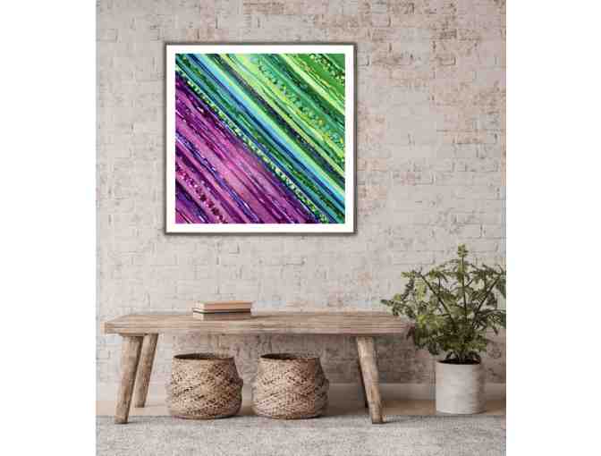 Shades of green, blue, purple and magenta create rows of abstract fields in this one-of-a-kind alcohol ink painting by Julie Wilmot.