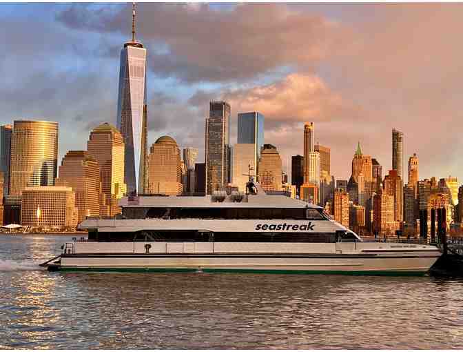 Two (2) round trip tickets aboard Seastreak ferry between New Jersey and New York City. Enjoy the Seastreak's plush and spacious seating, climate controlled cabins with full-service bar, 360 degree panoramic windows, private and clean bathrooms, and an open-air top deck for beautiful weather days.