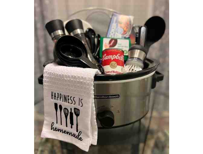The crockpot basket is perfect for a college student, new homeowner, wedding registry or a football Sunday! Included in the basket is a crockpot, ladle, measuring spoons, measuring cups, kitchen towels, oven mitt, spoon rest, scrub brush, salt and pepper, crockpot liners, $50 Publix gift card, can of cream of mushroom soup, and a can opener. It is the perfect started to all of your crockpot meal needs!