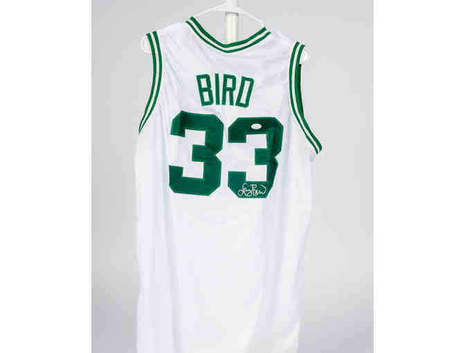 Boston Celtics basketball jersey signed by player Larry Bird.