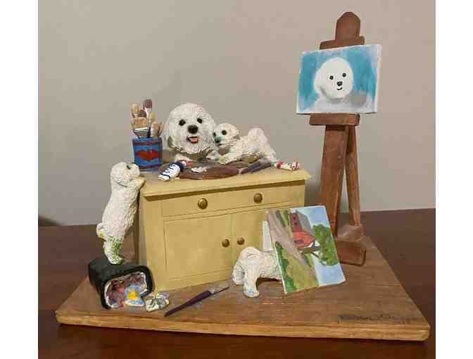 Gorgeous Bichon sculpture with little bichon puppies painting with mommy Bichon. Very detailed. Made of resin.
