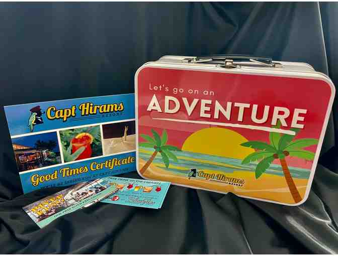 One word: Iconic! Get your Capt Hirams on with this amazing beachy lunch box filled with everything you need to experience this local treasure. Inside the box is a 2 night stay at the resort, a $50 gift card, and what they call a "4 Pack" (2 tickets to our River King Cruise and 2 free drink coupons), as well as other Capt goodies. Aye aye Captain!