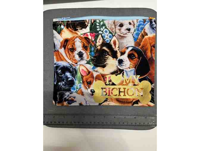 approximately 8"X10" cotton cloth bag with cute Bichon image and zipper top