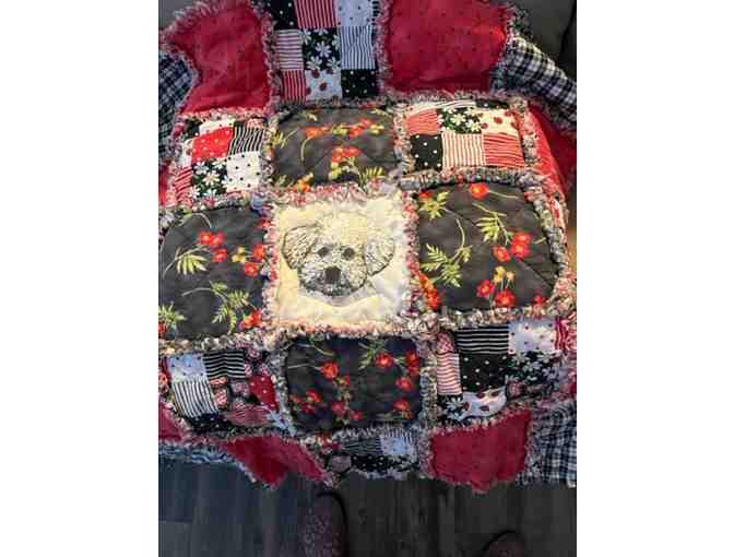 Bichon Patchwork Quilt 32inX32in. Each quilt is made of a variety of squares and machine stitched. Made by the Small Paws® Rescue Blanketeers.