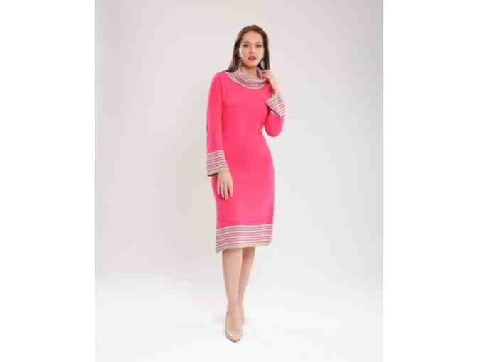 Beautiful knit dress for any occasion! This pink flared dress with exquisite rhinestone embellishment can be worn to a cocktail event and is sure to turn heads. Winner will select the size.