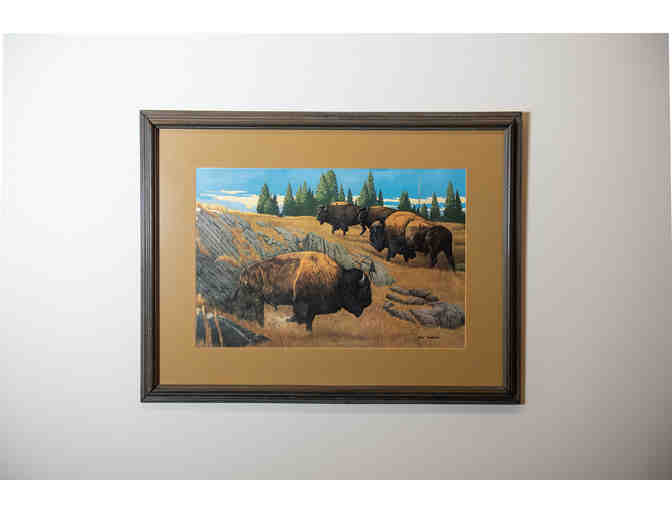 Print of artwork by Ron Dodell, featuring a four grazing bison.