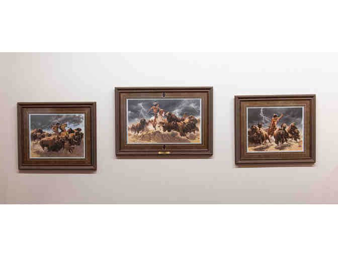 We are proud to present a captivating triptych by the illustrious Western artist Frank C. McCarthy, titled "Flashes Of Lightning, Thunder Of Hooves." This stunning set of three prints is a vivid portrayal of the untamed spirit of the American West, capturing the raw power and dynamism of its landscapes and wildlife.