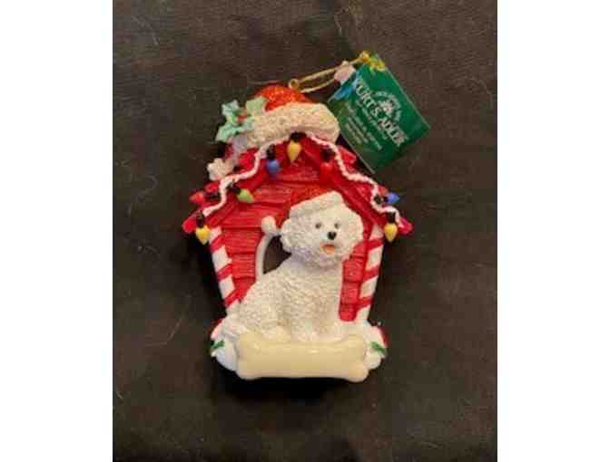 NWT, Adorable Bichon sitting in front of his dog house ready to hang on your tree! Measures 3 1/2 inches wide by 4 inches tall.