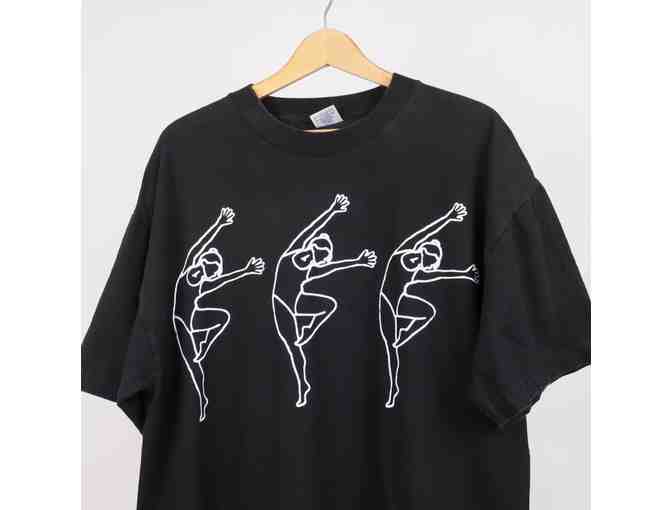 Vintage silk-screened t-shirt with jazz dancers in a reaching passe across the front by Artists in Motion Apparel. Sized for an over-sized fit.