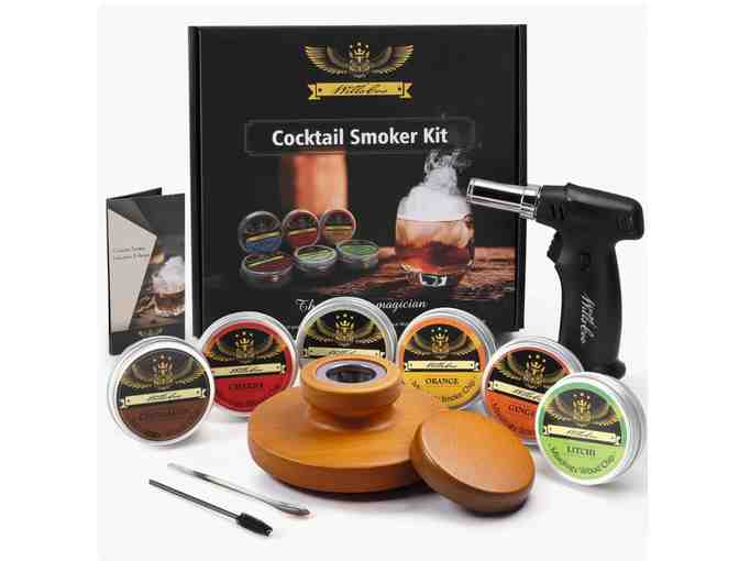 COCKTAIL SMOKER KIT: including hand-made wood cocktail smokerï¼wood smoker coverï¼Double layer stainless steel tube filterï¼6 flavorsï¼3 types new flavor: Orange, Ginger and Cinnamon and 3 type classical wood chips: Cherry, Litchi, Hickory. In addition, it is included a complementary cleaning brush, wood chips spoon, a torch.
