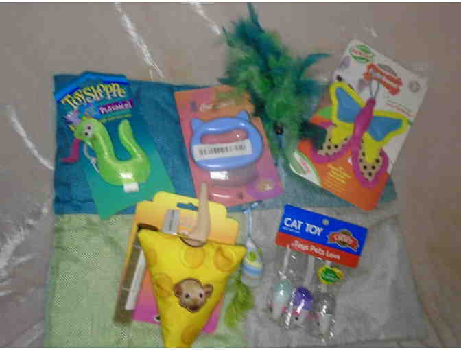 This box of cat toys has some fun toys - one that has its own little vial of catnip! There is a cat comb and a crinkle pad....cats love those crinkle pads...