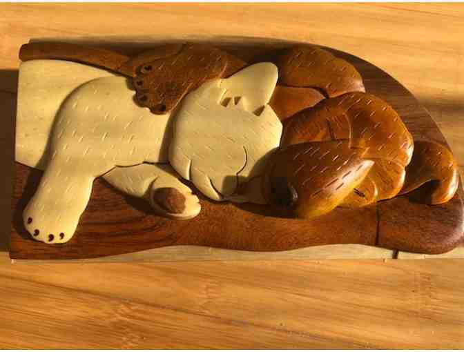 HAND CARVED WOODEN TRINKET/JEWELRY BOX WITH CAT AND DOG SNUGGLED TOGETHER