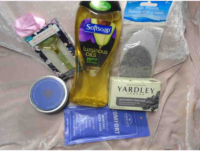 This big bath box has facial scrubbies, a bar of Yardley soap, Softsoap lubricating cleanser, a mineral soak for all over soothing, a mini green jade roller for skin care and a candle to add relaxing vibes to your bath time.