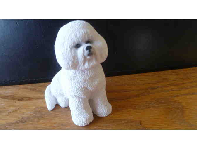nicely made small Bichon figurine stands 2.75" tall and 2" wide I am not sure what it is made of but it looks like plaster.