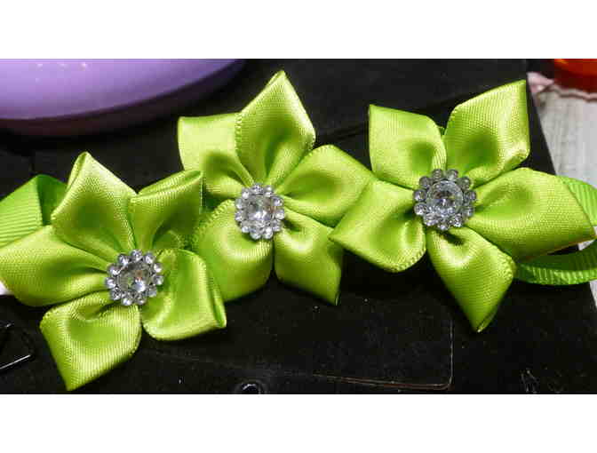 adjustable lime green ribbon caller with 3 rhinestone flowers