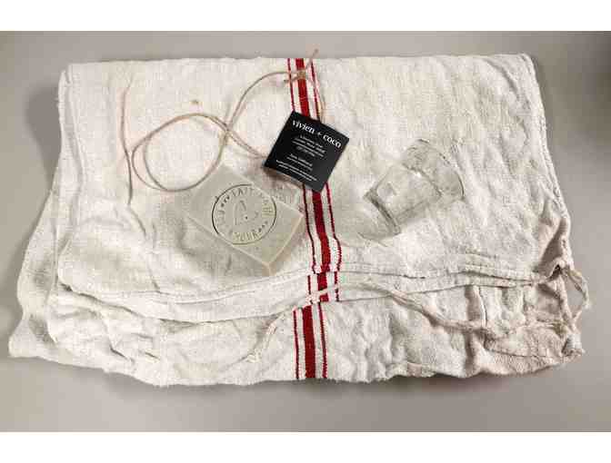 French Green Sack with drawstring opening - Measures 48" long x 19" wide - Color Off-white with Red Stripe