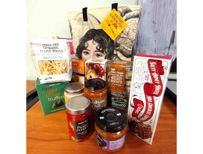 Trader Joe's Gift Bag includes Italian pasta and sauces, sweets, crackers, sparkling cider, biscotti, cheese sticks, truffles and a reusable Trader Joe's Tote Bag
