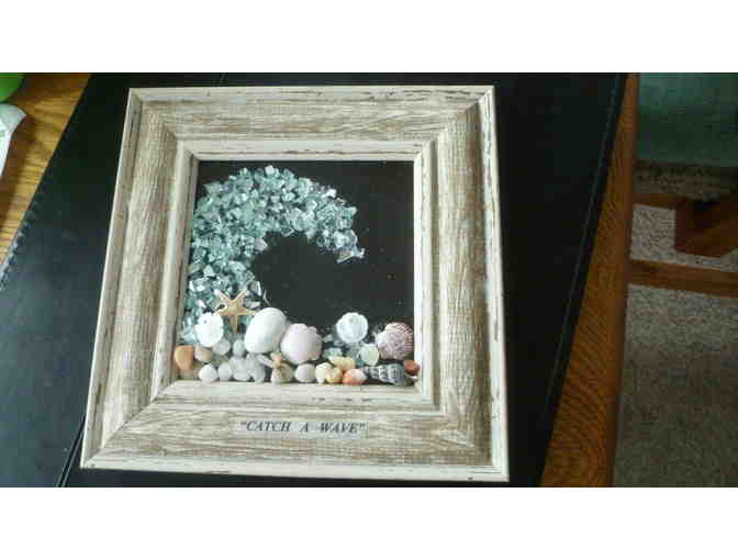 'CATCH A WAVE" small 7 by 7inch frame features shells and crushed glass. set it in a window to catch the sun or on an end table with easel provided. Perfect gift for the surfer! Handmade