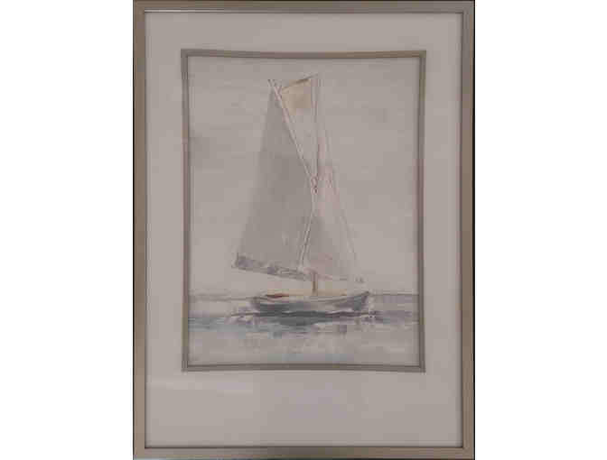 This framed watercolor print, donated by Hurlbutt Designs, depicts a sailboat on a calm sea. It measures 25" by 34".