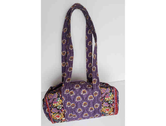Purple with gold/white/red/green flower motif patterns. Approximately 12 inches long x 7 inches high x 5 inches wide. Five interior open top pockets. The handle extends about 14 inches above the top of the bag so you can use it as a shoulder bag if you like. Very gently used in excellent condition, and I washed and dried it to prep it for the SPR auction.
