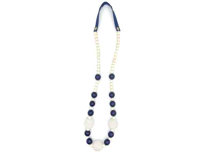 Treat yourself or a loved one with the "Perfect Catch" necklace from Hearne Dry Goods. This beautiful creation is handmade with their signature navy nylon strap, wood rounds, and accented by white hand-crocheted beads.