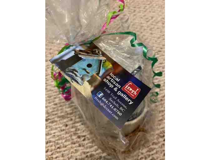 "Fresh from the Coast', a local artisan gift shop and gallery in Sechelt, presents a James Bennett mug filled with Davis BAY Tea and Chirstopher Norman Chocolates plus a Gift Certificate.
