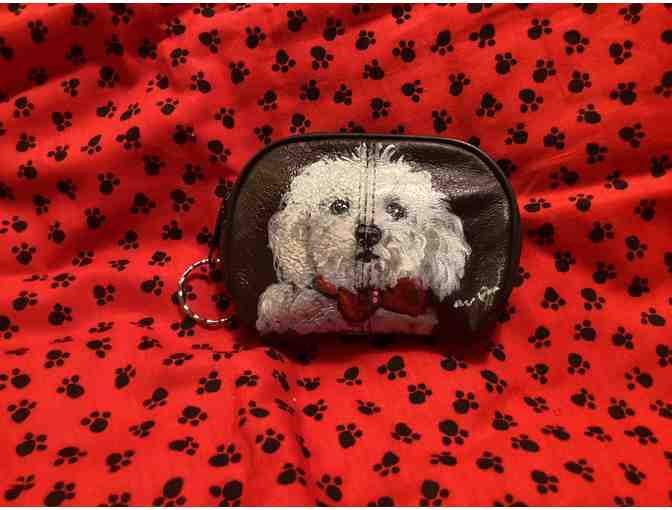 Look at that sweet little Bichon face who could resist that? All dressed up in his little red bow tie. Hand painting was done by well known artist, Pookie, Manuela Quick. She clear coated to last. Is made from a soft black leather and is lined with a silky black material"