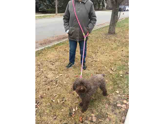 Hands-free dog leash - with the leash across your body, your hands are free to eat, drink, or use your phone. If you do want to hold the leash, the round rope is more comfortable than traditional flat leashes. I like it because it prevents my dog from suddenly leaping away when she sees another dog. The leash is 7.7' long and 1" in diameter and is made of durable nylon. Suitable for dogs less than 132 pounds (and humans less than 5 foot 10in)